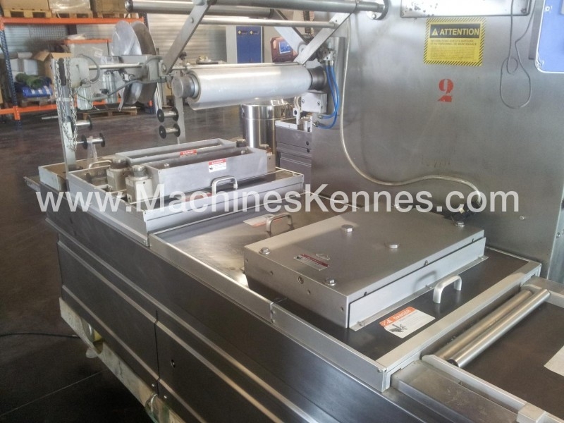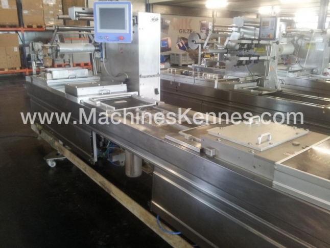 This used Multivac R530 Thermoformer is built in 1994. On the PLC in the machine is standing operating hours. The machine has a film width of mm and there is a dye set on the machine with an exit of mm. The format is now divided in a format. The machine is equipped with formats. These formats can be used for packaging. The format does not have a stamp. The frame of the machine is currently mm long, but we can always adjust this to the dimension you need.
