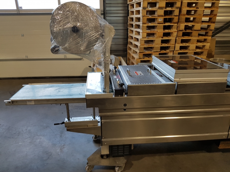 This used Multivac R530 Thermoformer is built in 2004. On the PLC in the machine is standing operating hours. The machine has a film width of 520mm and there is a dye set on the machine with an exit of 480mm. The format is now divided in a 2.2 format. The machine is equipped with 1 format. This format can be used for Soft and Rigid Film packaging. The format does not have a stamp. The frame of the machine is currently 9500mm long, but we can always adjust this to the dimension you need.