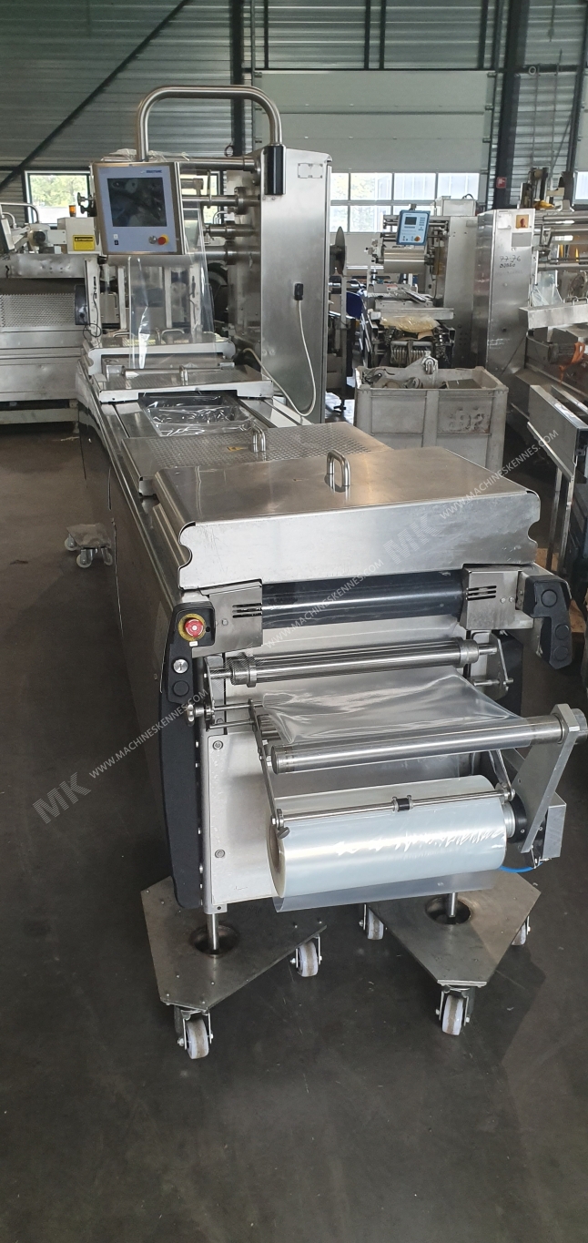 Deze gebruikte Multivac R145 Dieptrekmachine is van bouwjaar 2011. De machine heeft een foliebreedte van 420mm en er is een formaat geplaatst met een afslaglengte van 300mm. Het formaat is nu opgedeeld in een 1.1 indeling. De machine is voorzien van 1 formaat. Dit formaat kan voor Zachtfolie verpakkingen gebruikt worden. Het formaat beschikt niet over een stempel. Het frame van de machine is op dit moment 3500mm lang, maar kunnen wij altijd naar wens aanpassen.