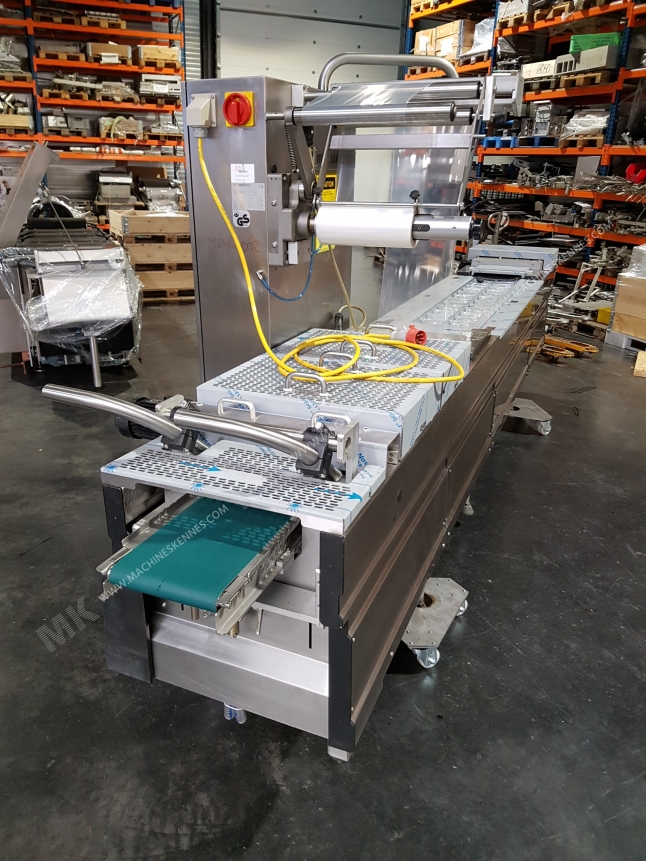 Deze gebruikte Multivac R230 Dieptrekmachine is van bouwjaar 2003 / 10. Op de PLC staan 13000 draaiuren. De machine heeft een foliebreedte van 320mm en er is een formaat geplaatst met een afslaglengte van 255mm. Het formaat is nu opgedeeld in een 2.2 indeling. De machine is voorzien van 1 formaat. Dit formaat kan voor Zachtfolie verpakkingen gebruikt worden. Het formaat beschikt niet over een stempel. Het frame van de machine is op dit moment 6500mm lang, maar kunnen wij altijd naar wens aanpassen.