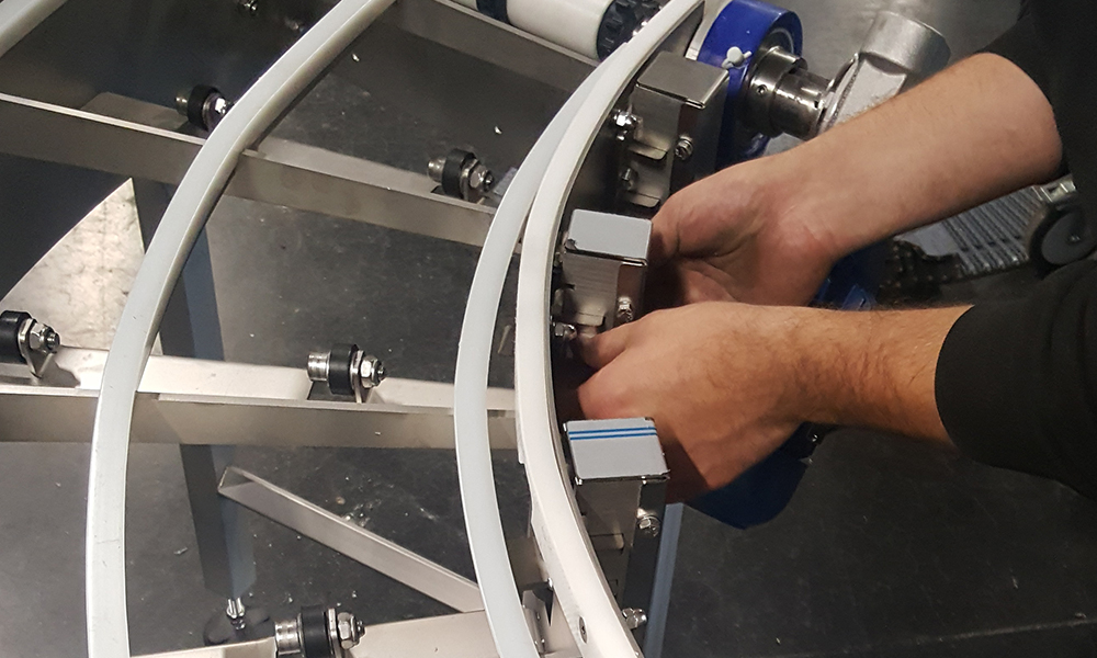 In Kooperation mit MK von Intralox, wird ein Biege Gilze Band entwickelt, die nur einer Biegung von 90 Grad besteht. die Band ist somit ohne begehbaren und ohne Auslauf. Für weitere Informationen kontaktieren Sie uns.