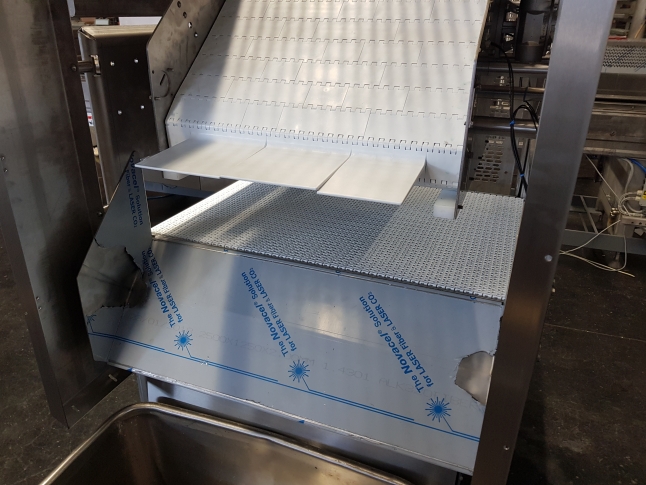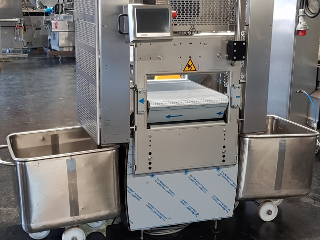 this machine is suitable for pouring 10 kg products into a limited length. the products are pushed off the belt by means of plastic flights. a different machine must be installed for this module to develop an error signal.